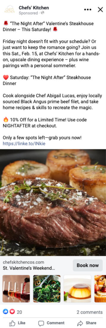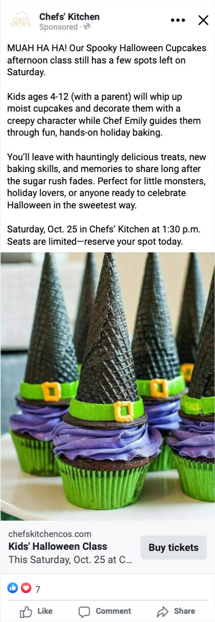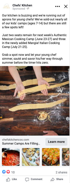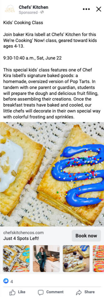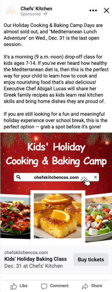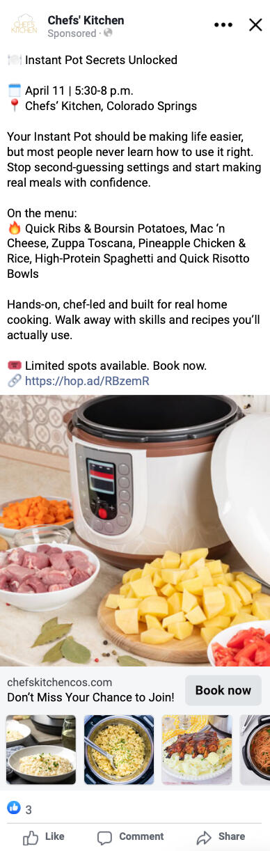 Chefs’ Kitchen is an industrial kitchen that partnered with the owner of We’re Cookin’ Now! to offer ticketed cooking events to locals and their kids in the Colorado Springs area. I was hired to sell event tickets through paid social ads and to remarket to the database with additional SMS and email sequences.