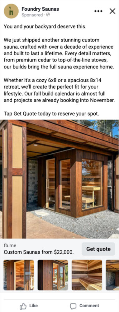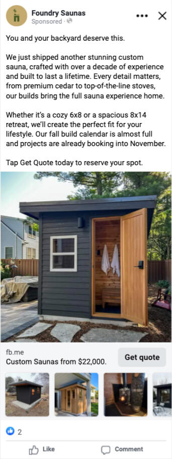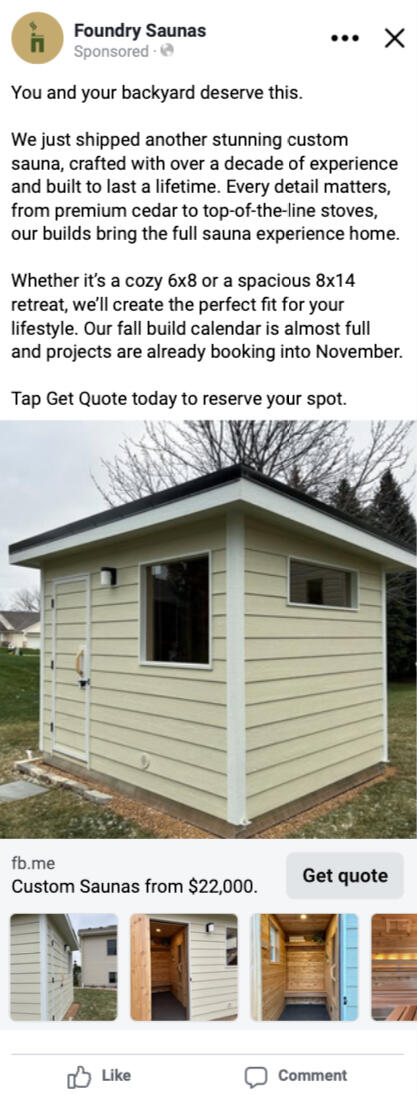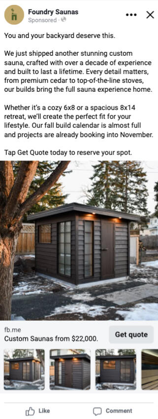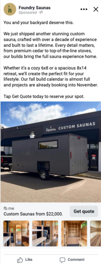 Foundry Saunas is the West Coast distributor of Voyageur Saunas. They sell top-of-the-line premium saunas that are not barrel or kit models. I was hired to generate high-quality leads and build nurture SMS and email sequences to turn those leads into deals. This also included setting up the CRM and related software systems.